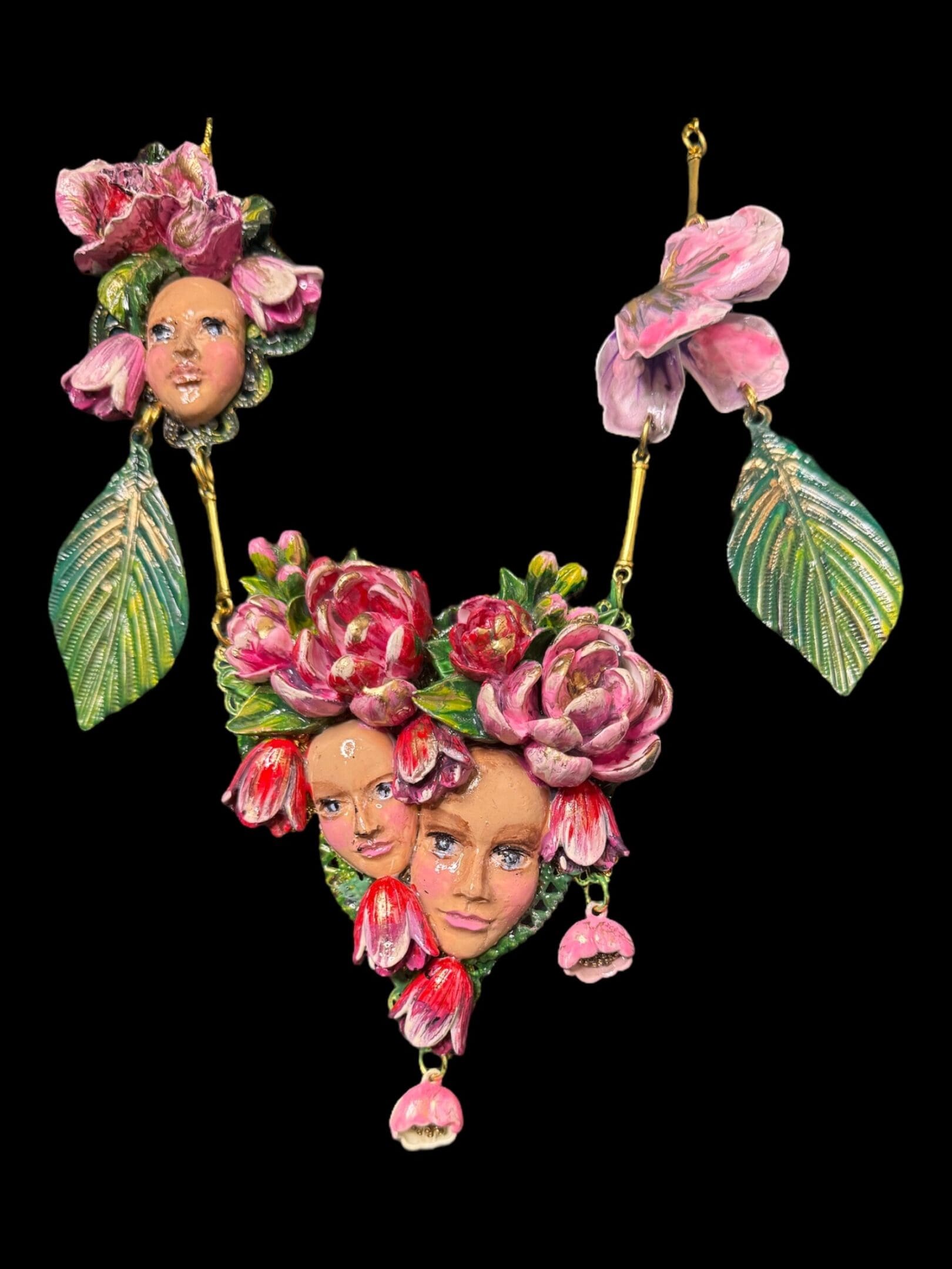 Home / Handmade Necklace / 224 Art Jewelry Faces Floral Unusual Massive Necklace