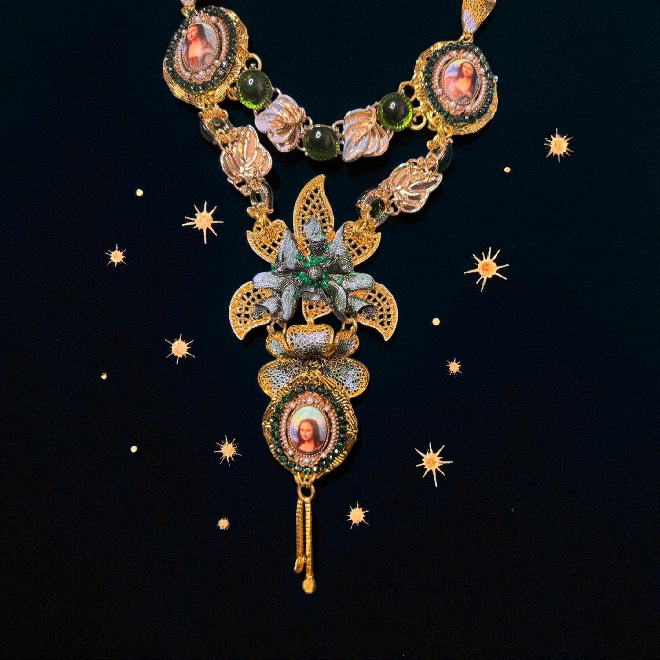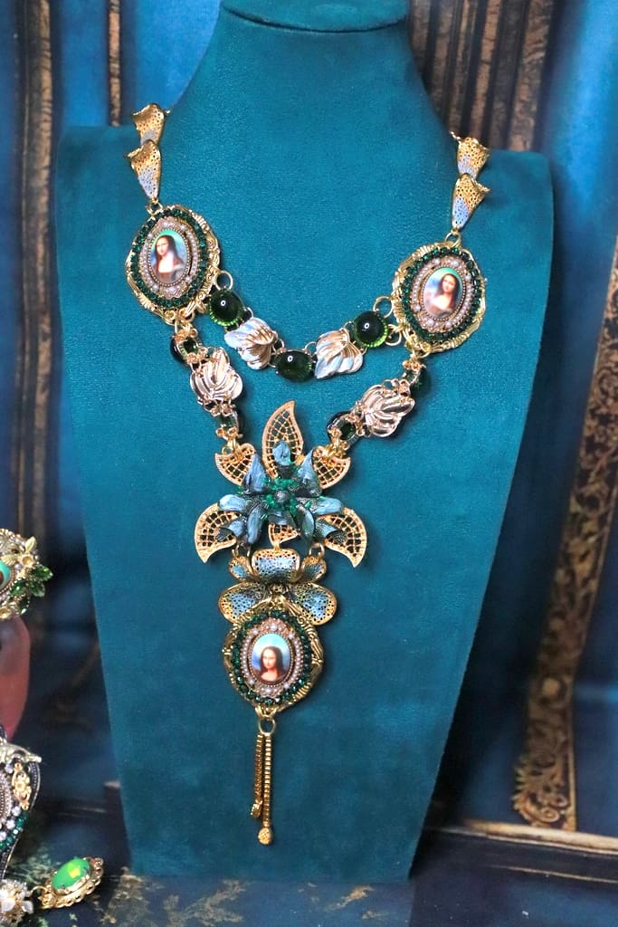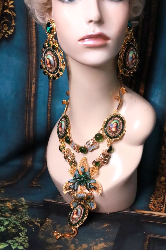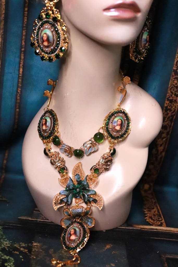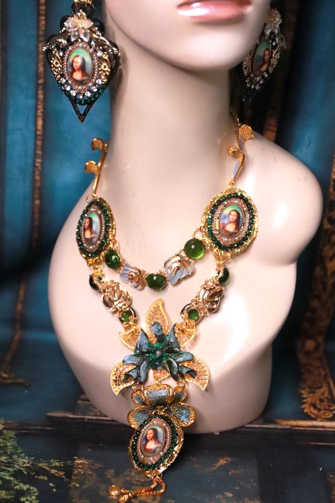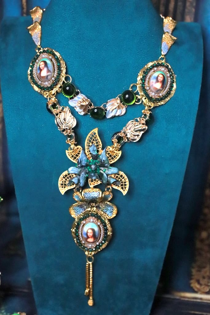 Mona Lisa Cameo Green Flower Massive Necklace