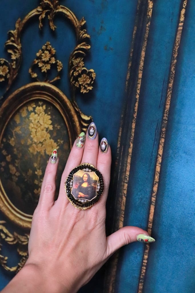 SOLD! 237 Mona Lisa Cameo Green Flower Cocktail Adjustable Ring - Image 6