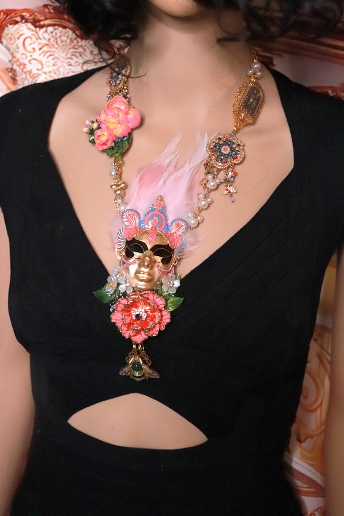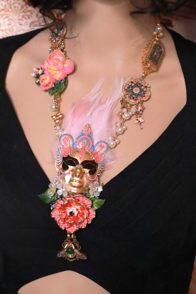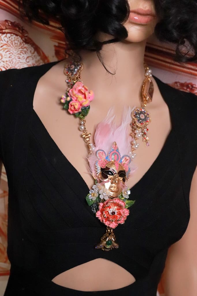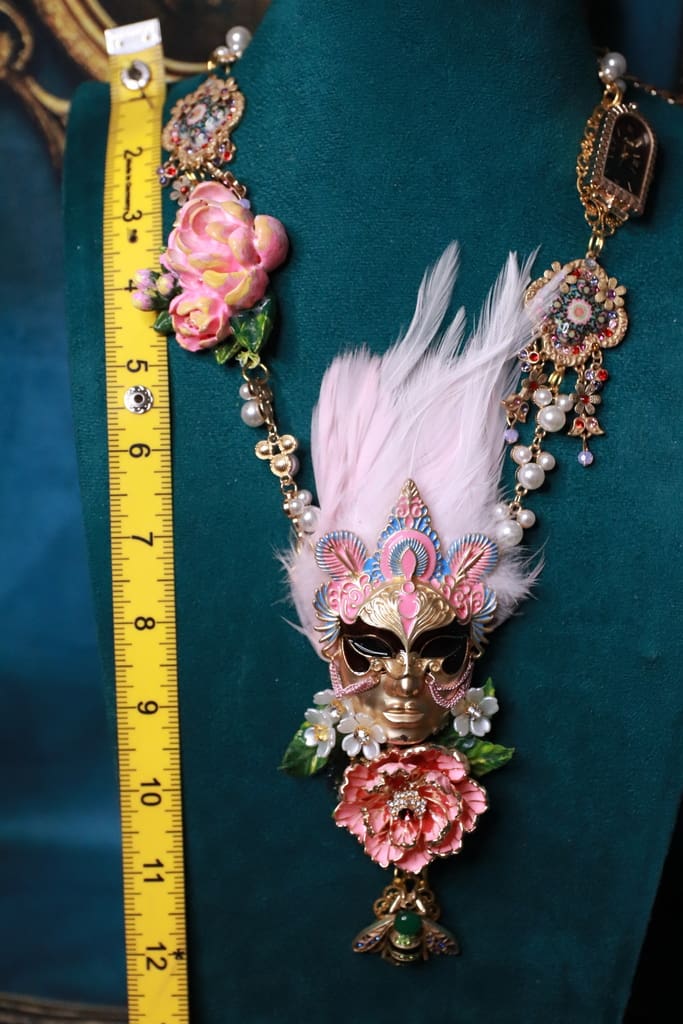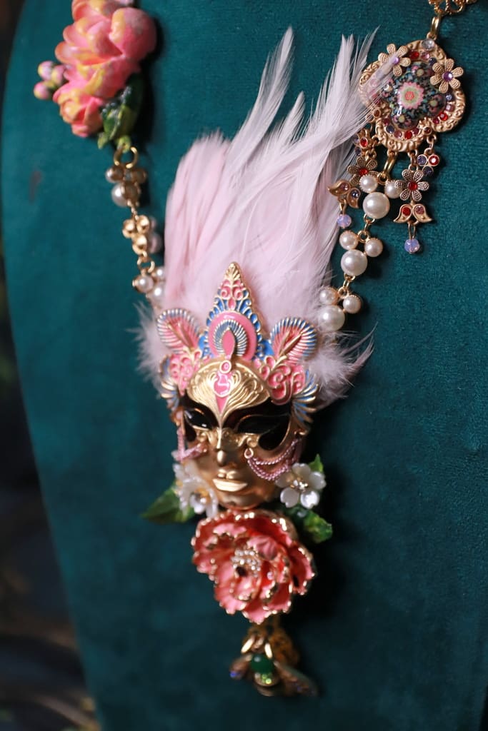 / 383 Venetian Mask Floral Feather Statement Art Deco Necklace