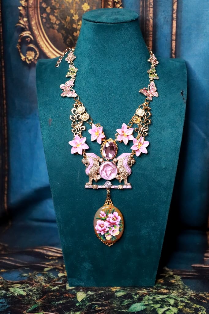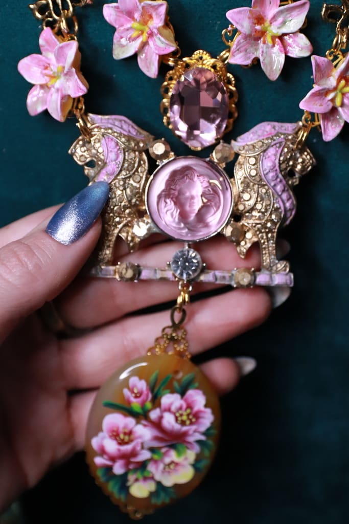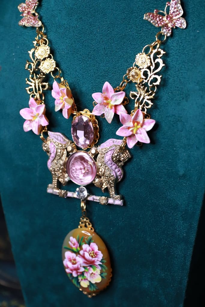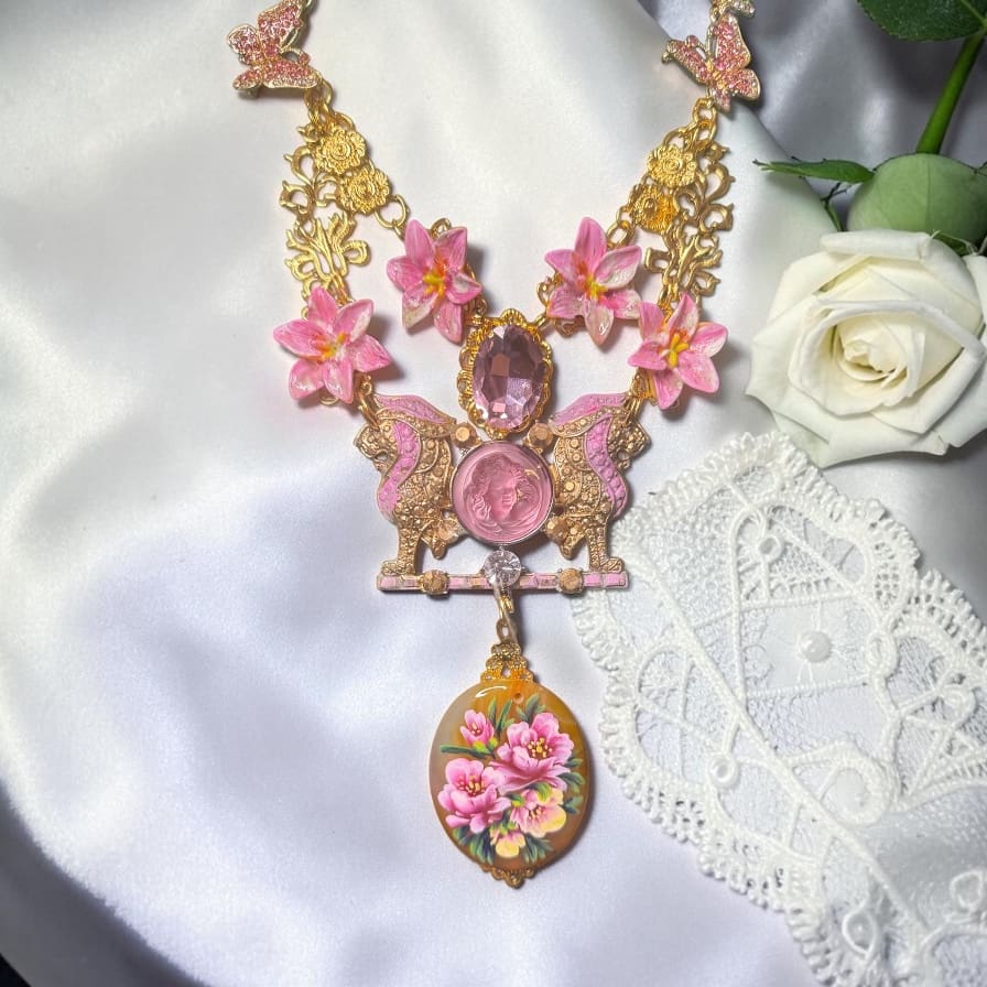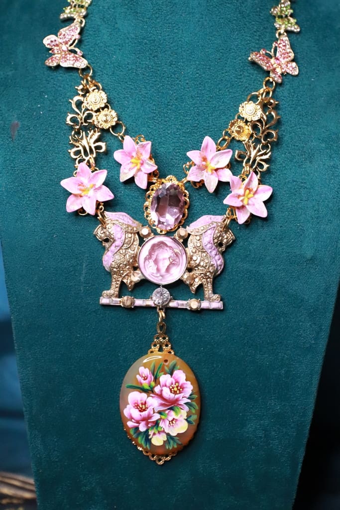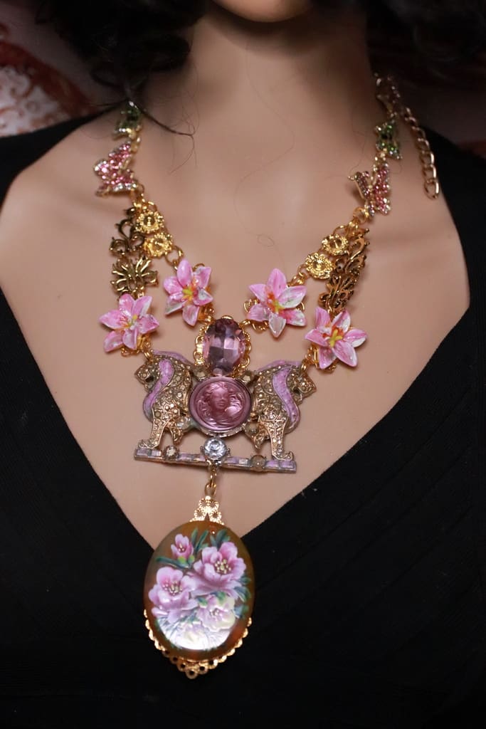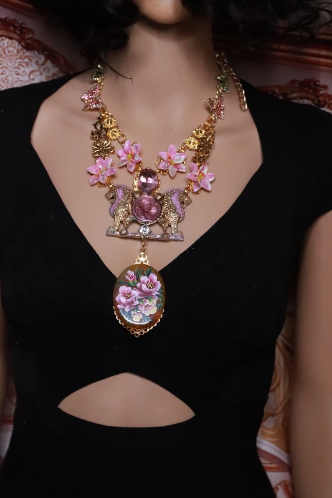 Art Jewelry Genuine Agate Hand Painted Lions Statement Necklace