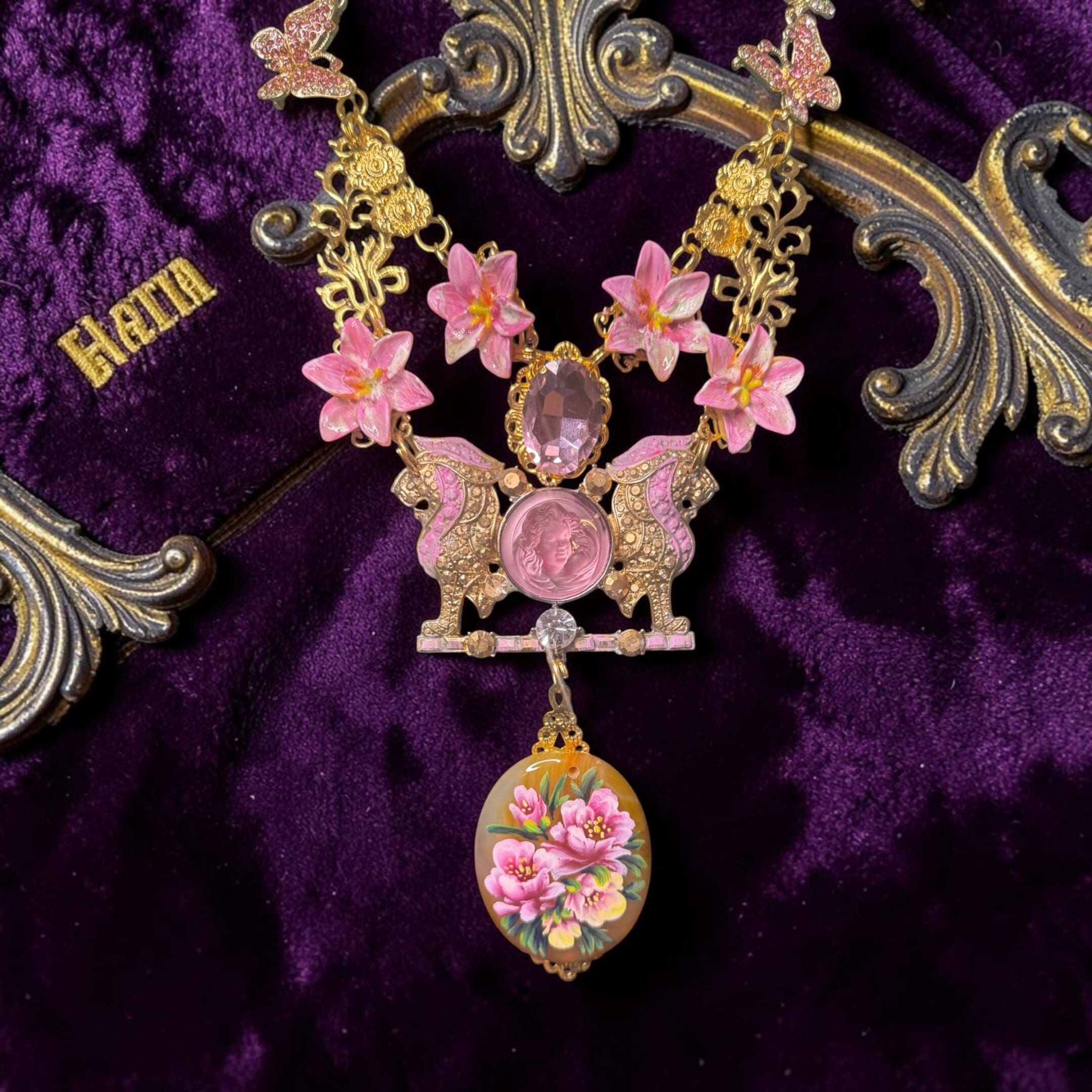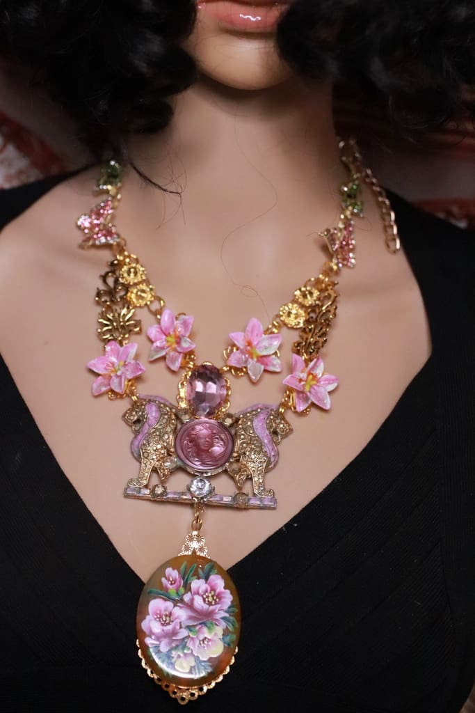 426 Art Jewelry Genuine Agate Hand Painted Lions Statement Necklace