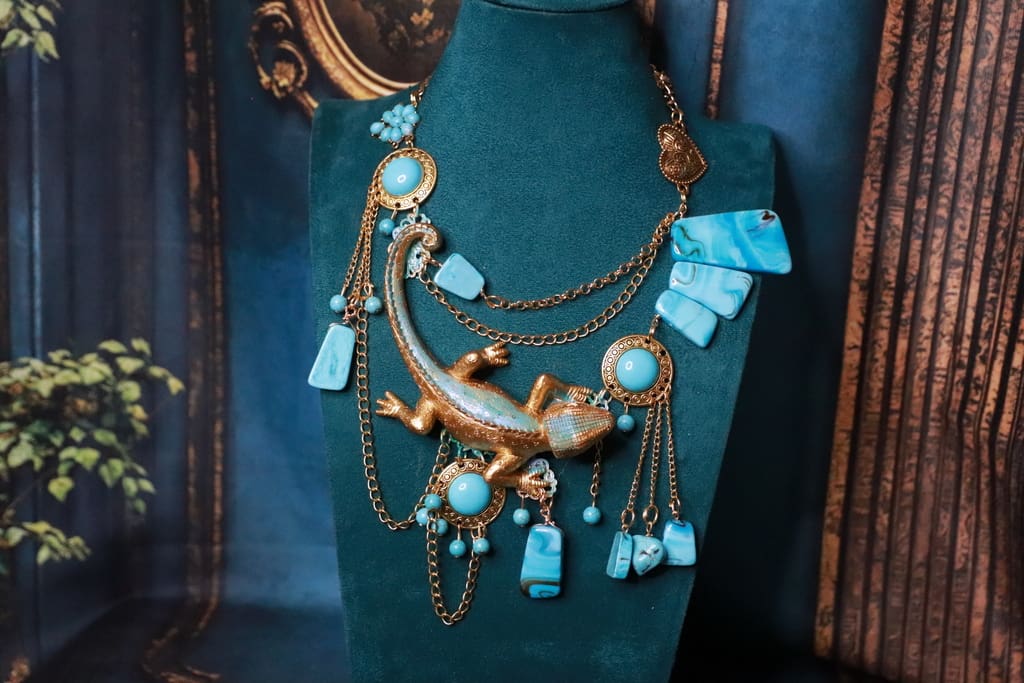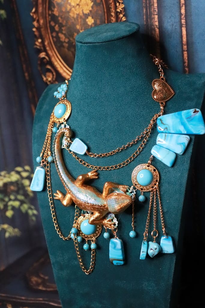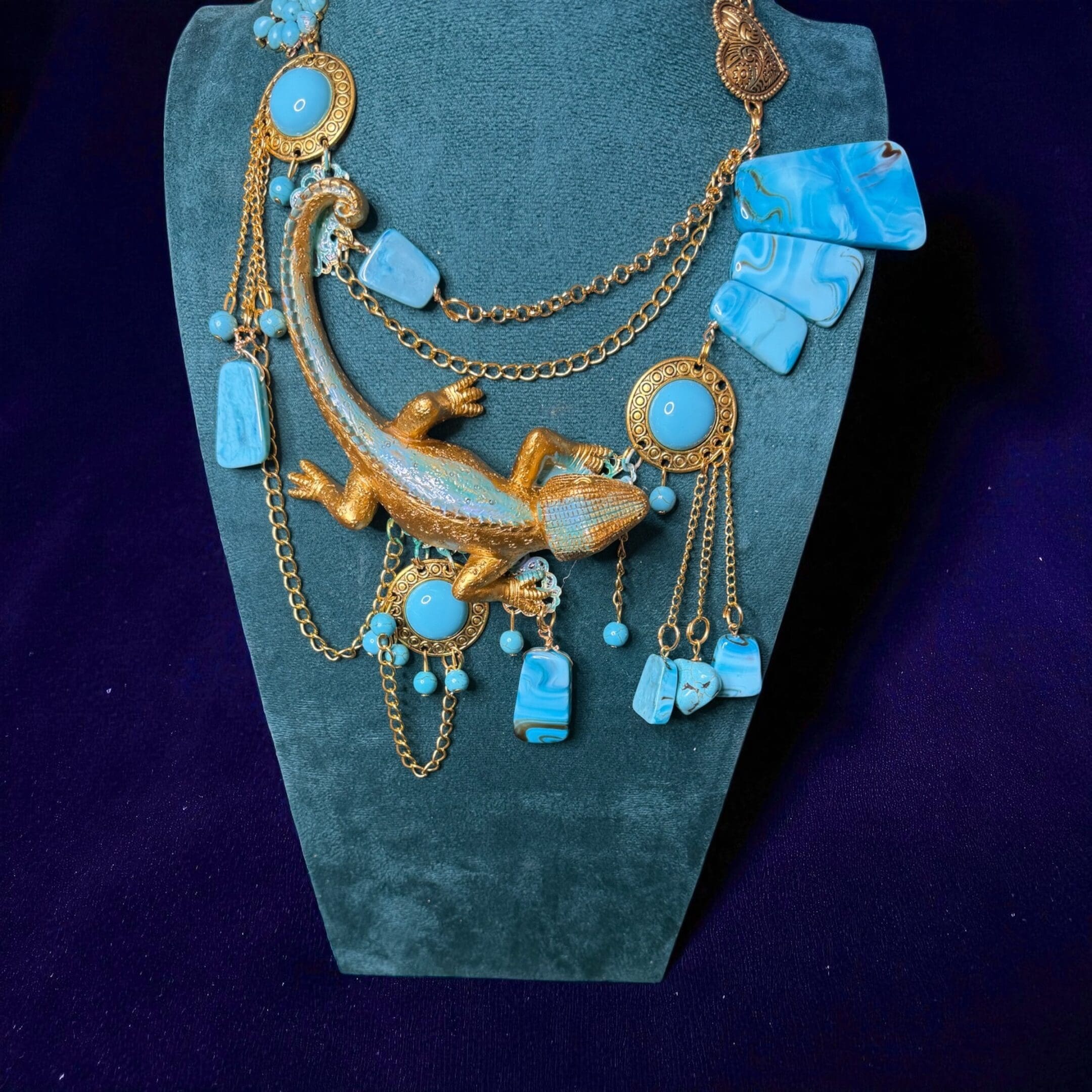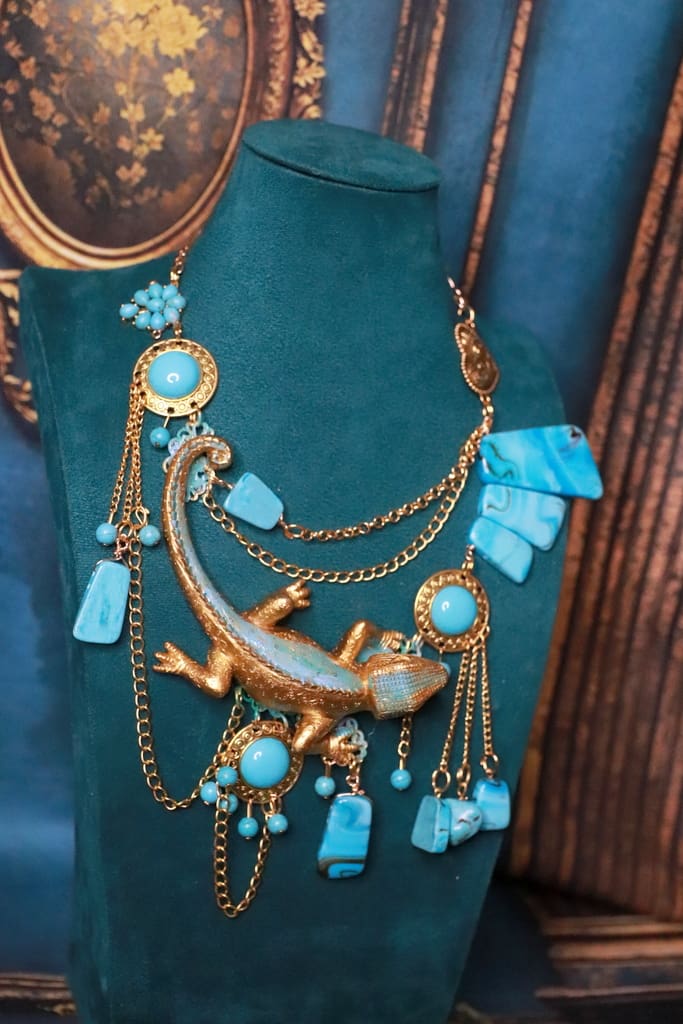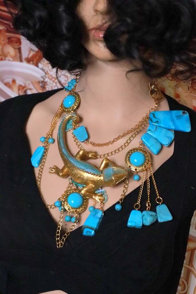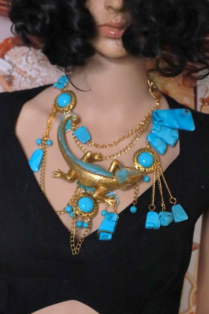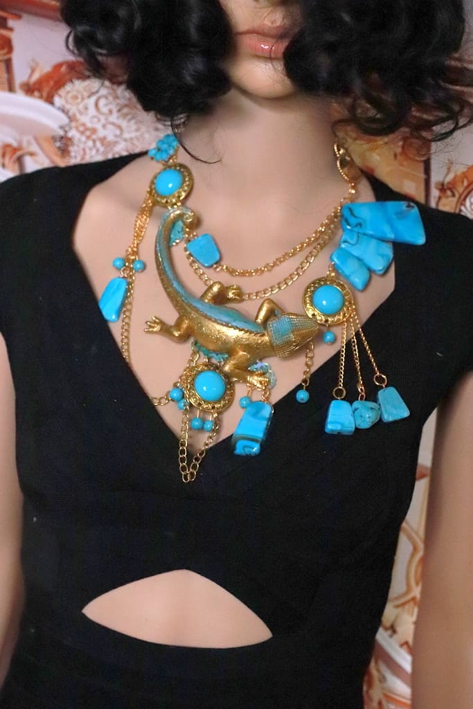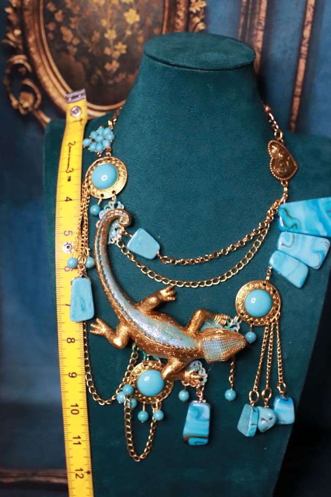 Categories: NEW, Sold Tag: Art Jewelry Gold Tone Lizard Turquoise Massive Necklace